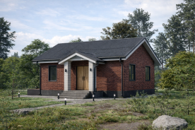 В проекте Милино дизайнерам удалось сделать очень гармоничный дизайн дома из СИП панелей. Шатровая крыша, аккуратное крыльцо с оградой, отделка под кирпич. Все это создает позитивное настроение и очень гармонирует с названием.