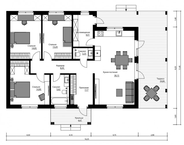Две дополнительные спальни, светлая кухня-гостиная и просторная прихожая формируют гармоничное пространство для жизни. Два санузла и техническое помещение добавляют удобства, а уютная терраса станет идеальным местом для отдыха на свежем воздухе.